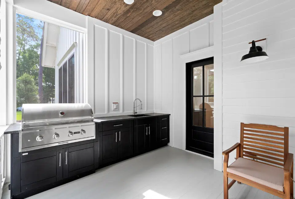 A large mother-in-law suite adds flexibility for extended family, and the double back porches extend the living space outdoors. The outdoor fireplace, finished in natural stone, became a key feature of the project and one of its most distinctive details. It was both technically challenging and rewarding, serving as a centerpiece for the back porch. Inside, closet designs were carefully planned to maximize function and efficiency, using every inch of space without sacrificing comfort.